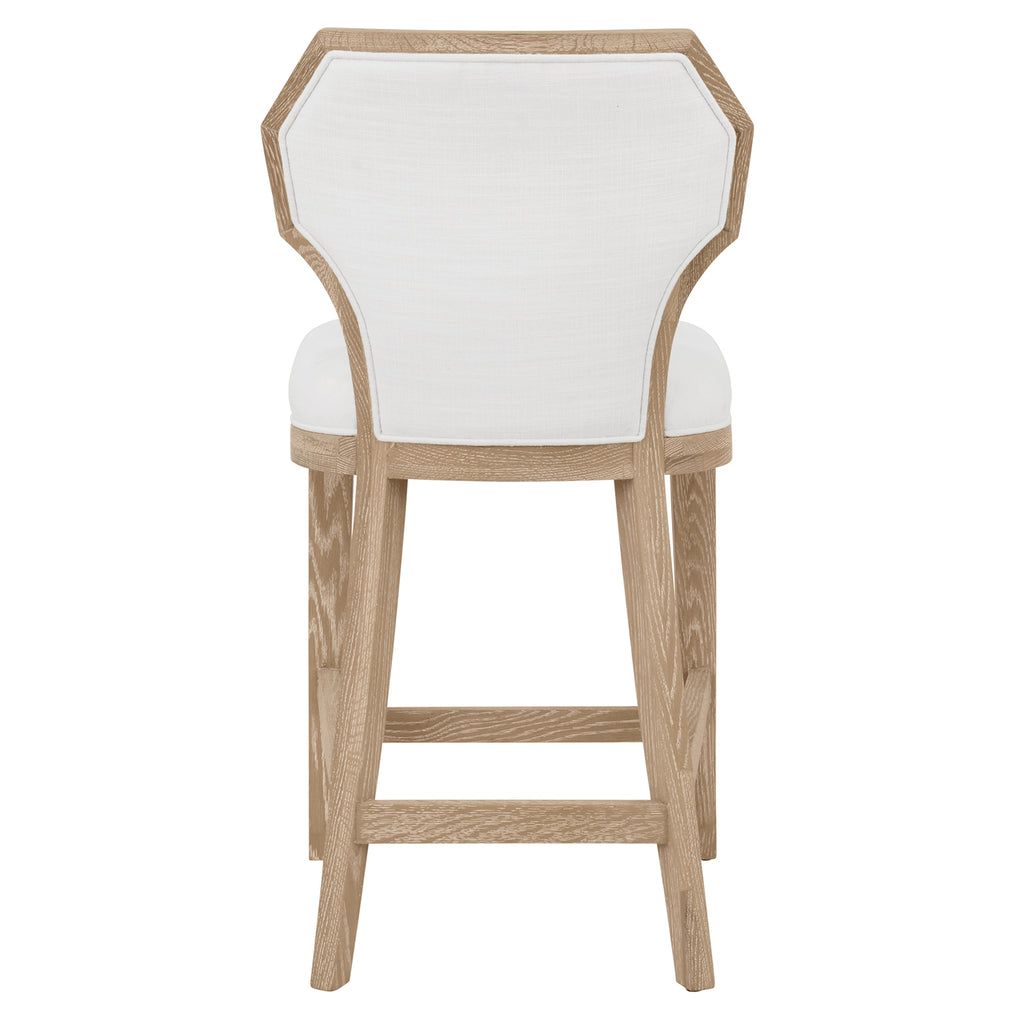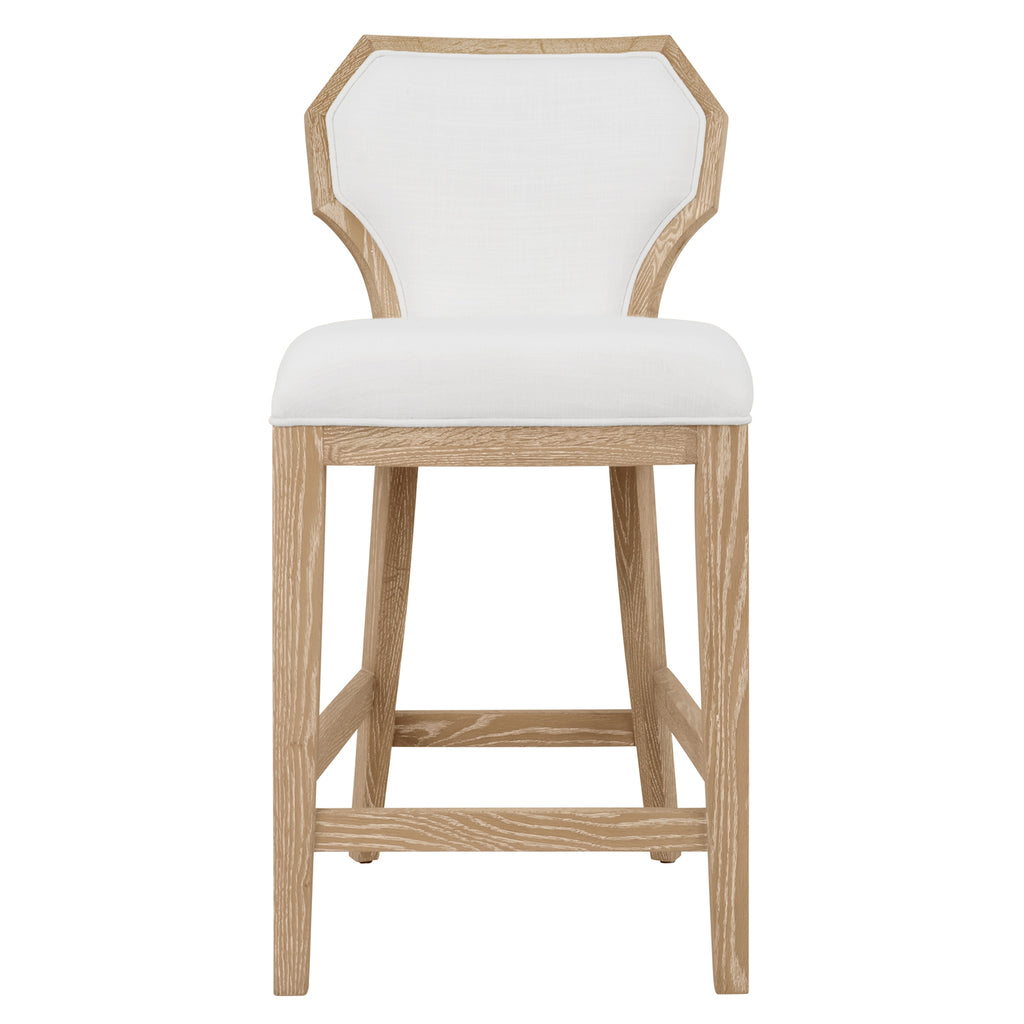 Counter stool with curved angle back in cerused oak with performance white linen upholstery