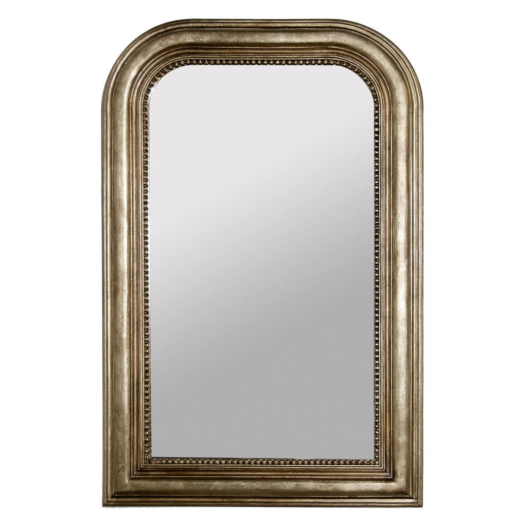 From Worlds Away, this wall mirror invites guests to peer into its design with contemporary allure. Hang this accent in a foyer, hallway or living room for a statement look. Handcarved gold leaf or silver leaf curved top rectangular mirror. Non-antique mirror.