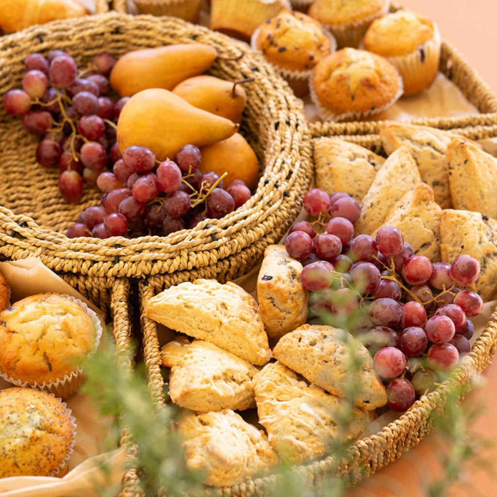 Crafted from woven vine with a rich, earthy tone, this five piece serving set adds natural texture to entertaining. The round base tray holds fits into coordinating pieces, making it easy to serve fruit, pastries, or small bites. Functional and beautiful, it brings an effortless, rustic touch to gatherings.