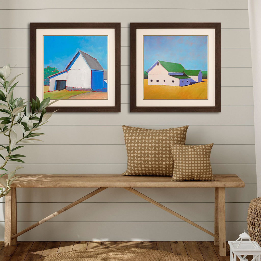Vintage barns are modernized with exhilarating color. Matted in oyster and framed in a flat profile moulding with distressed dark wood finish.