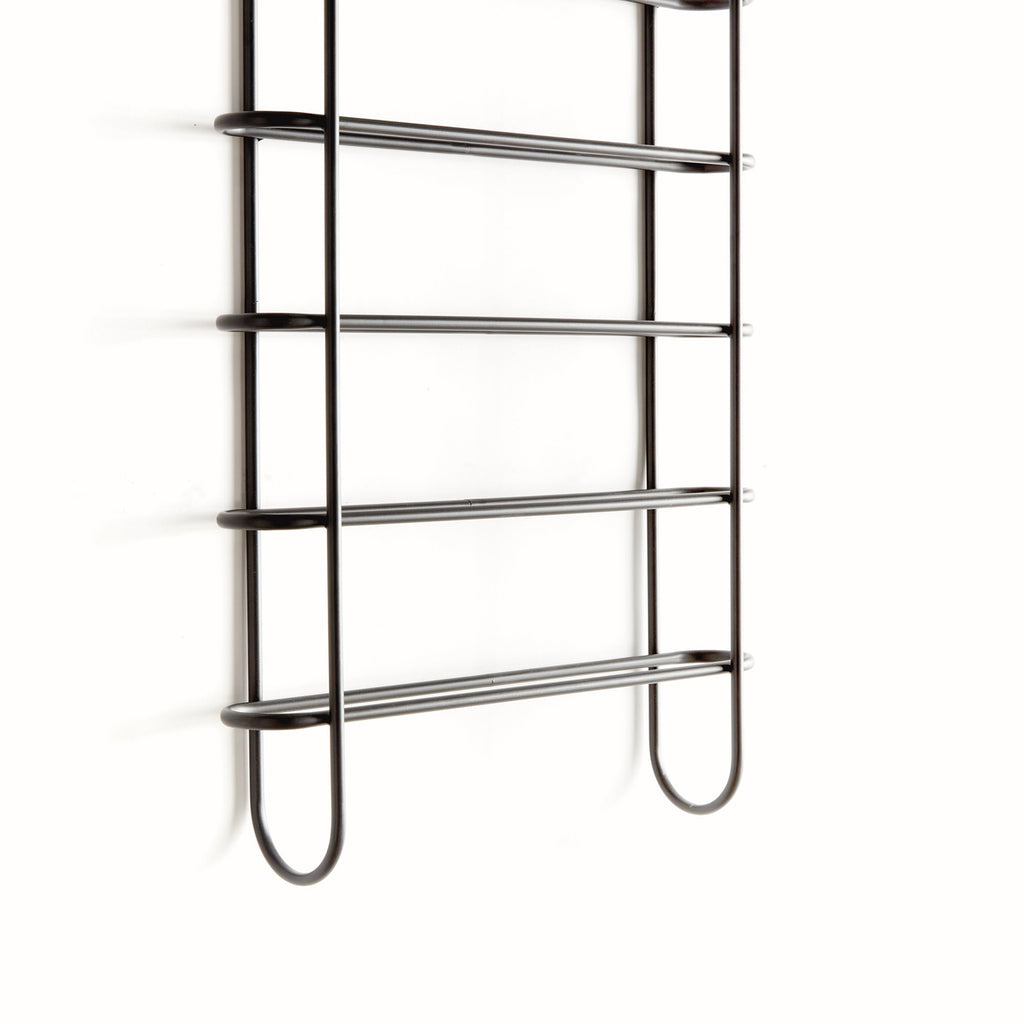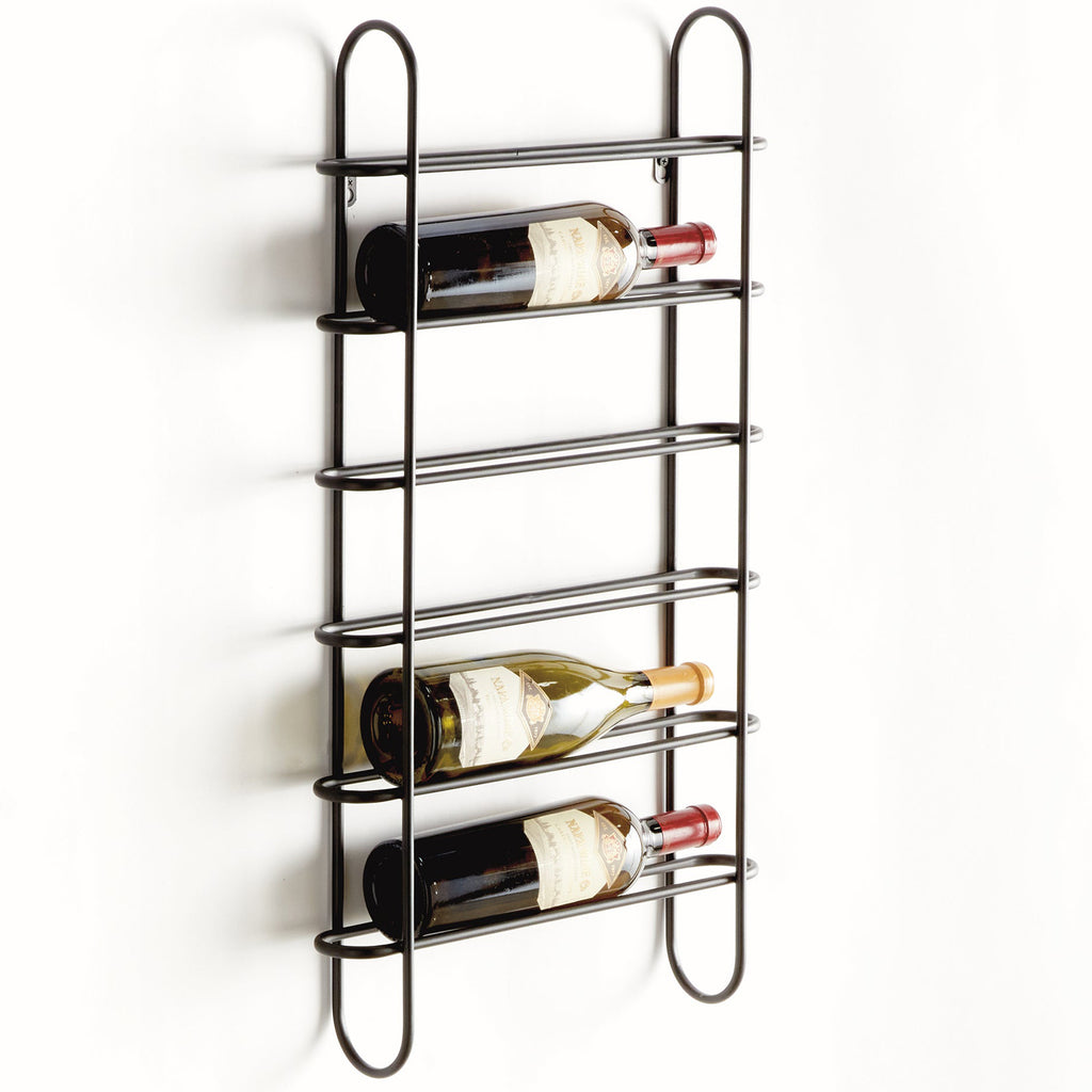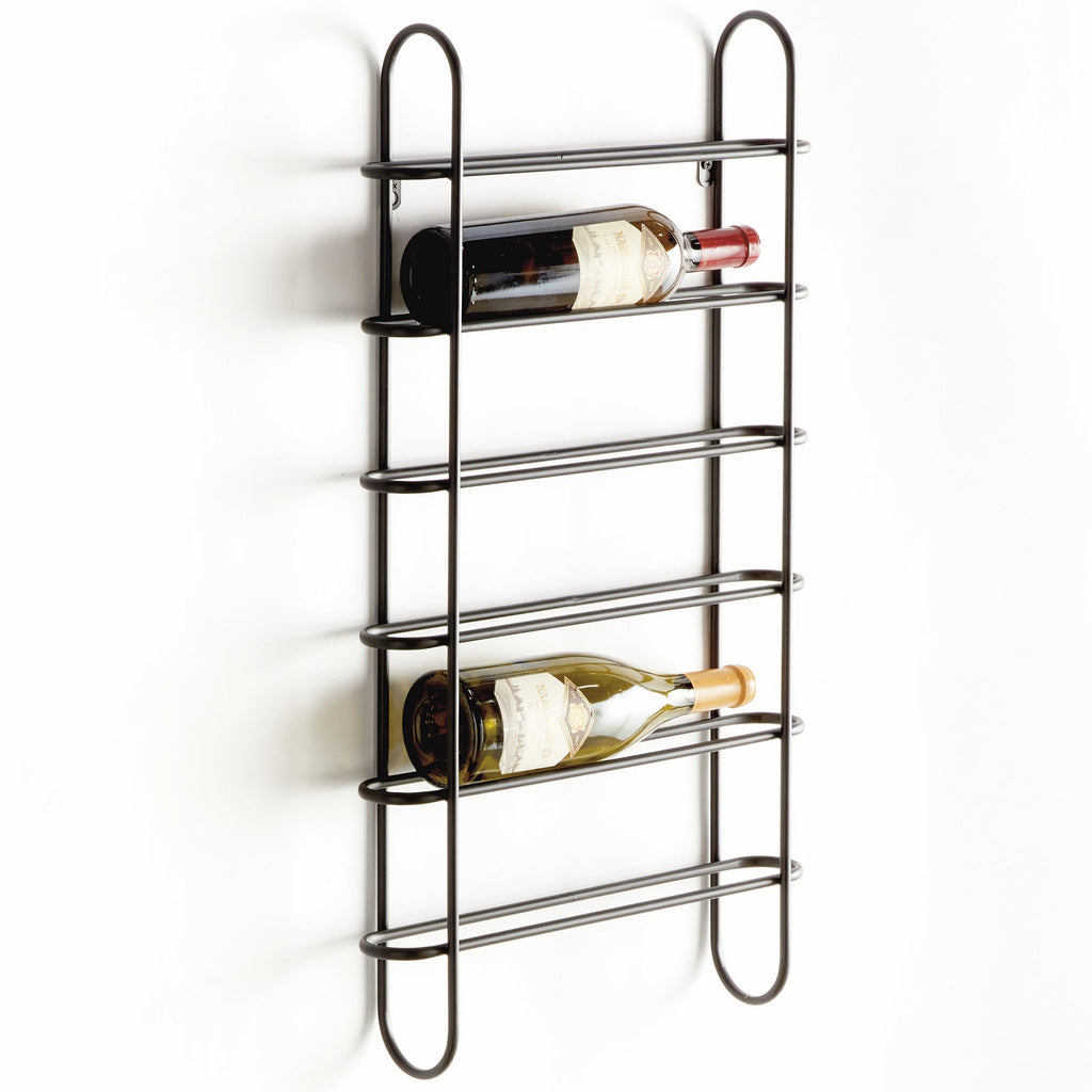 Clean and modern, this updated design is made of round metal stock. It effortlessly showcases your favorite six bottles. A sturdy, wall-mounted design, it uses a minimal floating shelf design for a lighter look.